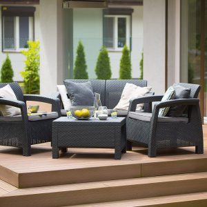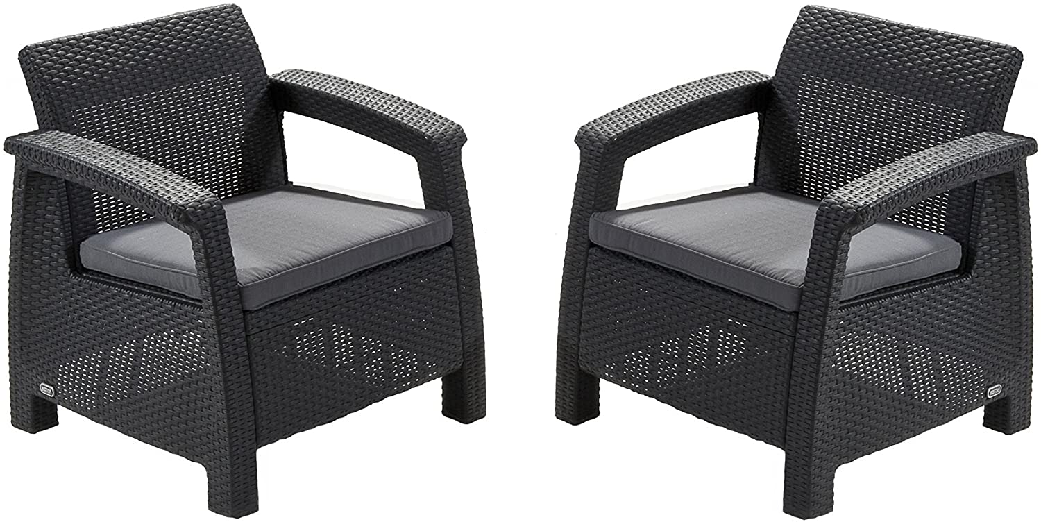 Corfu Duo armchairs rattan effect Curver graphite is a bestseller specially designed for the balcony. This is ensured by two elegant armchairs. Corfu Duo garden set in graphite color will fit perfectly into any composition and will combine well with any Curver Corfu set in the same color