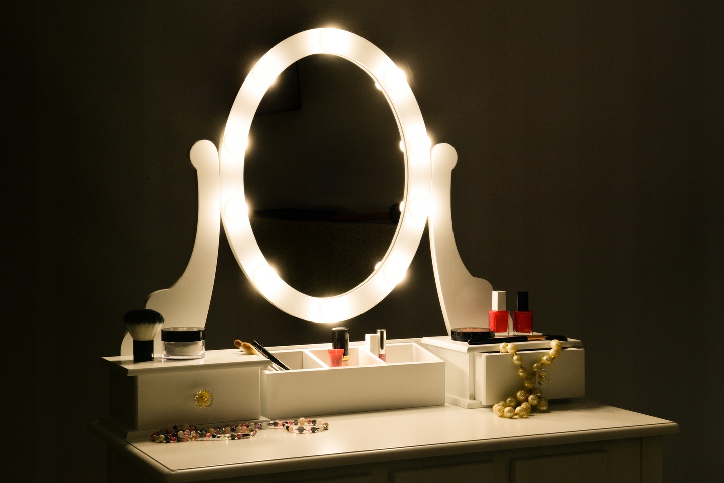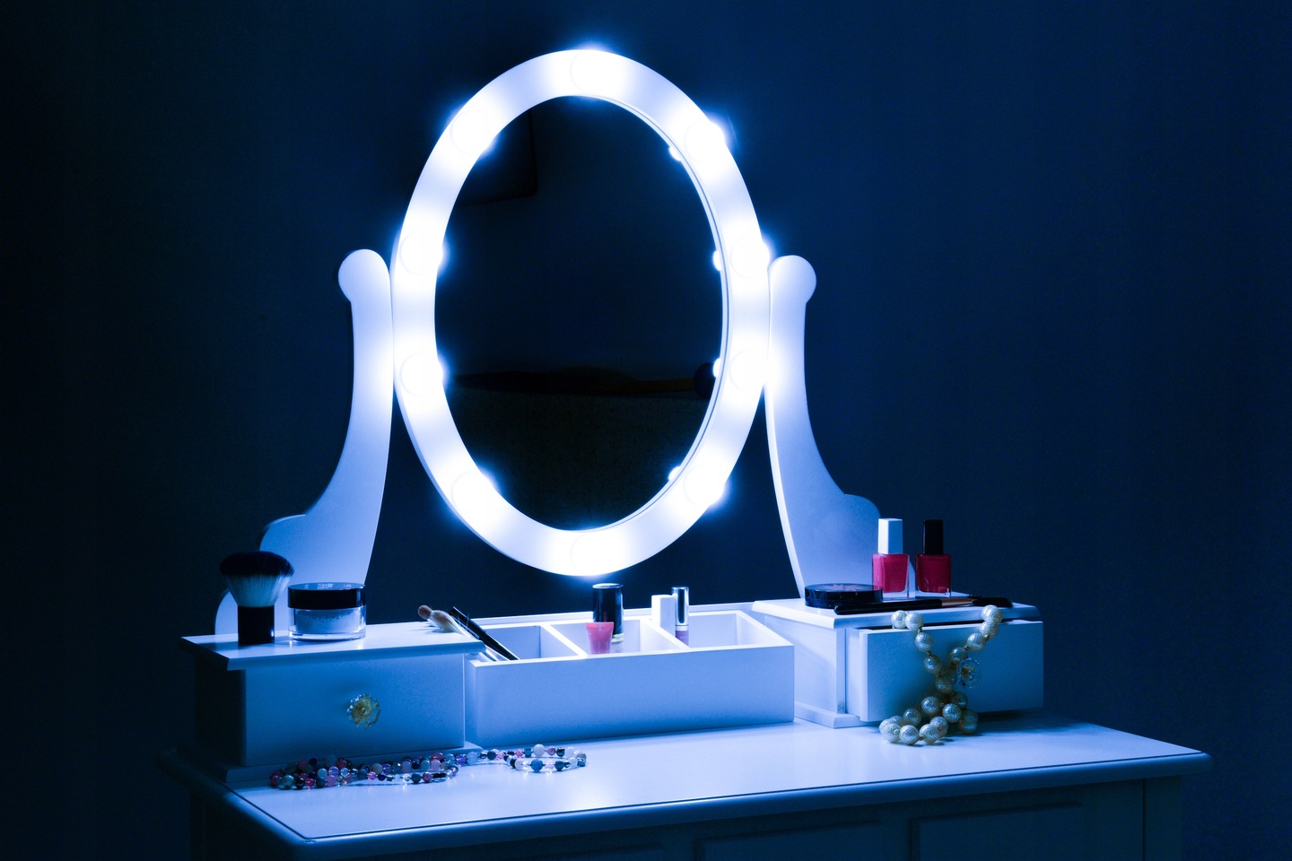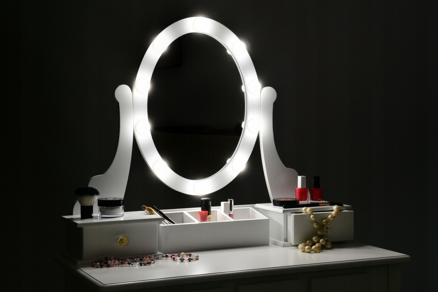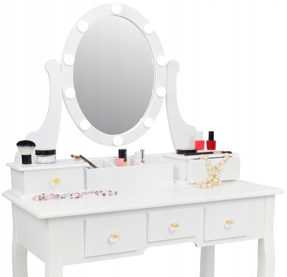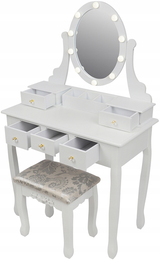 The set includes a comfortable, upholstered stool. Equipped with a rotating LED mirror, 5 drawers and 3 compartments for jewelry and accessories. We can place our favorite cosmetics on it.